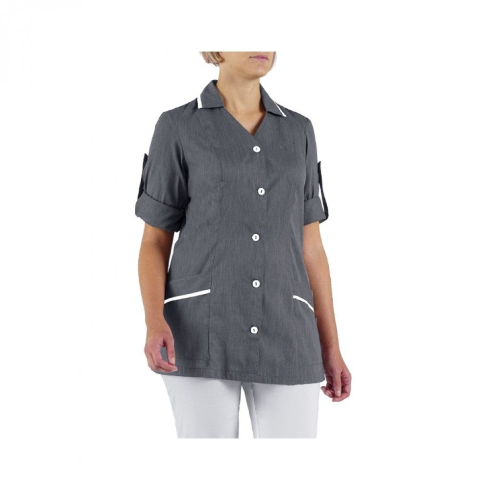 Casacca donna manica lunga arrotolabile, colore grigio, 65% poliestere 35% cotone, 115 gr, 2 tasche abbottonatura classica, collo tipo camicia.