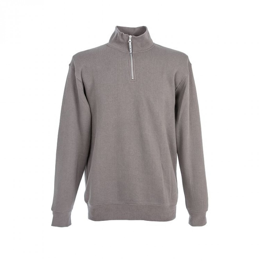 Felpa grigia con mezza zip, 50% cotone 50% poliestere, 280 gr, polsini e fondo elasticizzati, cuciture ribattute.