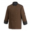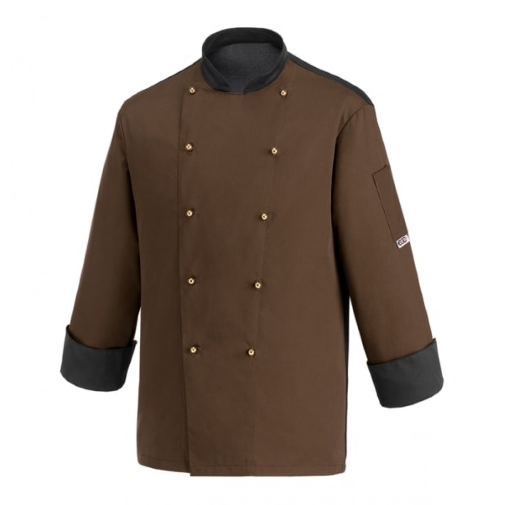 Giacca cuoco manica lunga, colore marrone con collo e polsi in nero, 65% poliestere 35% cotone, 200 gr, bottoni a funghetto, schiena in tessuto traspirante Air Plus, taschino portapenna sulla manica sinistra.