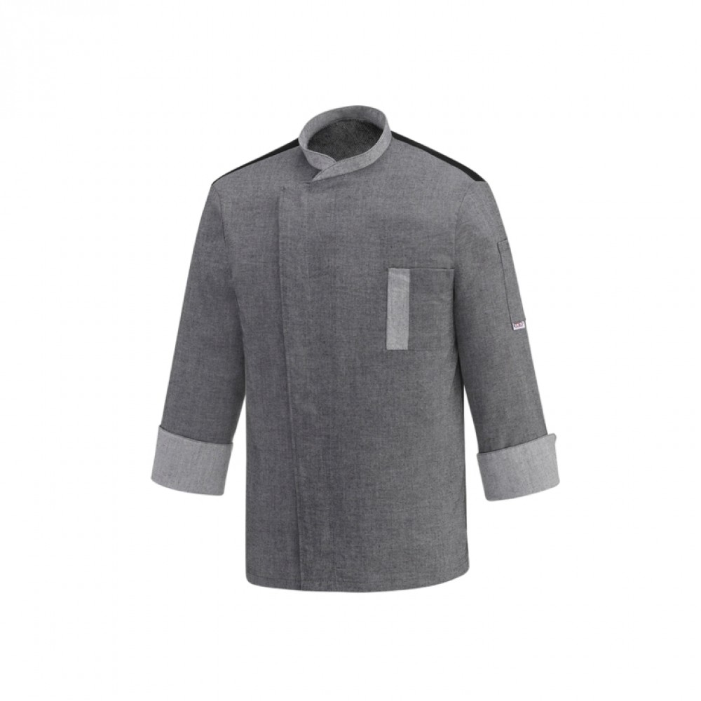 Giacca cuoco manica lunga, colore grigio, 65% poliestere 35% cotone, 150 gr, tessuto leggero, bottoni a pressione, tasca al petto, taschino portapenna sulla manica sinistra, schiena in tessuto traspirante Air Plus, tessuto stiro facile.