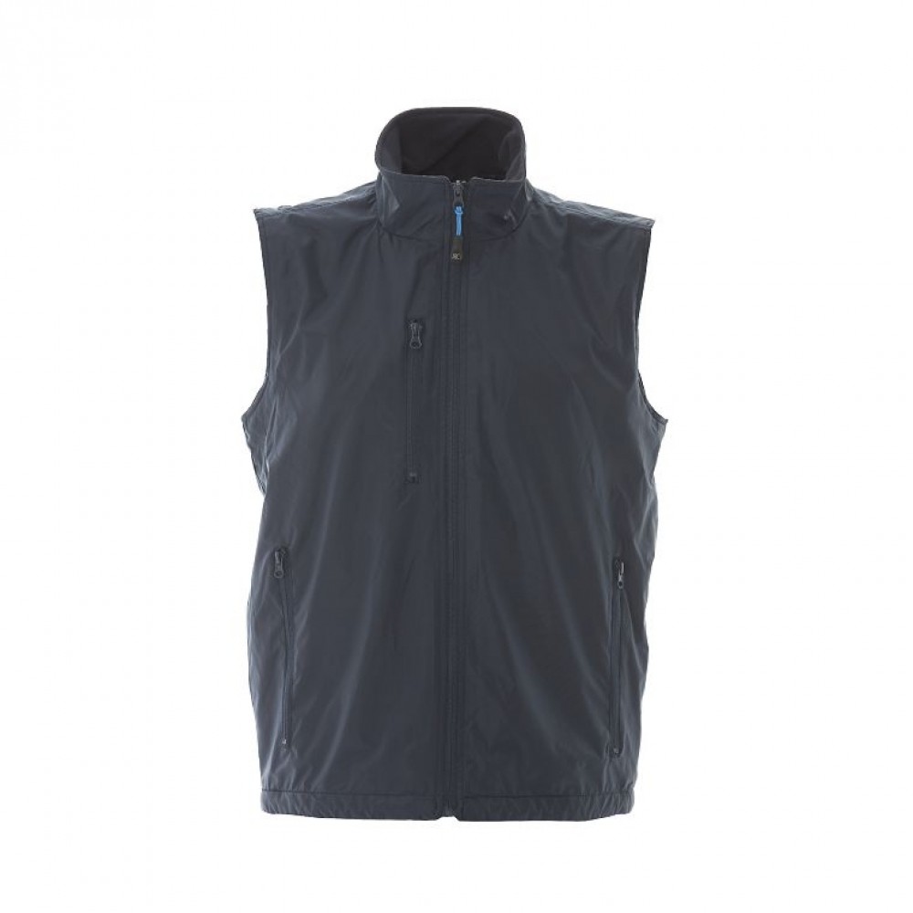 Gilet in pvc impermeabile, fodera in pile, 200 gr, 3 tasche con zip, elastico al giromanica, tasca interna, coulisse al fondo.