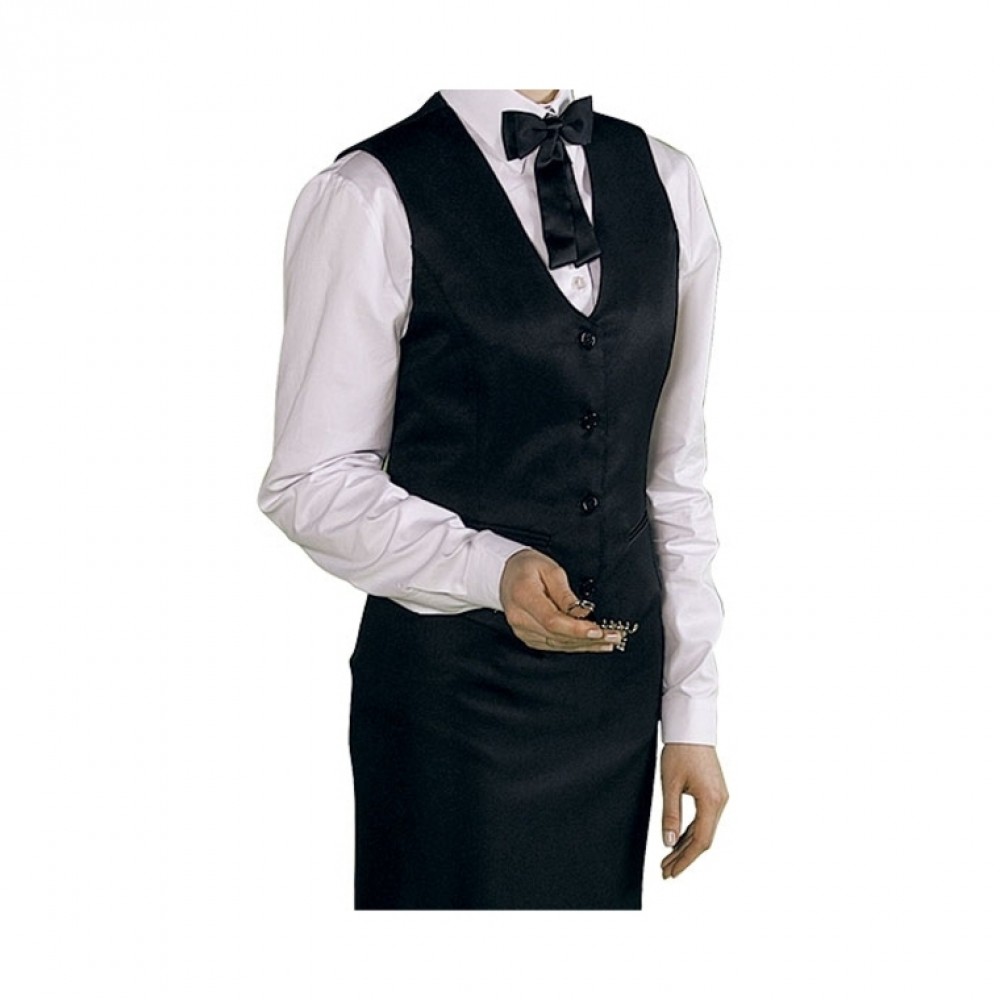 Gilet donna sfoderato colore nero, 100% poliestere, abbottonatura classica, finte tasche, disponibile dalla XS alla XXL.
