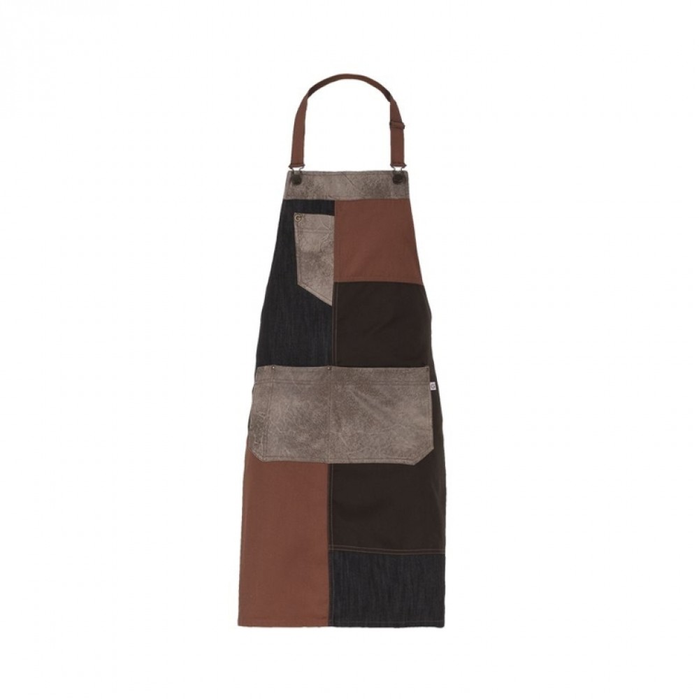 Grembiule con pettorina stile patchwork nero jeans-terra-moka, tasche centrali, taschino portapenna, allacciatura al collo tipo salopette regolabile, lavabile a 60°.