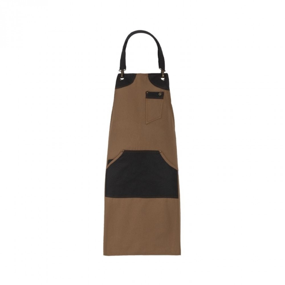 Grembiule con pettorina 100% cotone e finta pelle, colore ocra, grammatura spessa 260 gr, tascone centrale, taschino portapenne, allacciatura al collo con ganci in metallo regolabile dalle fibbie, lavabile a 60°.