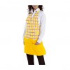 Grembiule unisex giallo con nella parte superiore gioco di quadri bianchi con riga rossa, 50% poliestere 50% cotone, 160 gr, tascone parte inferiore, allacciatura al velcro.