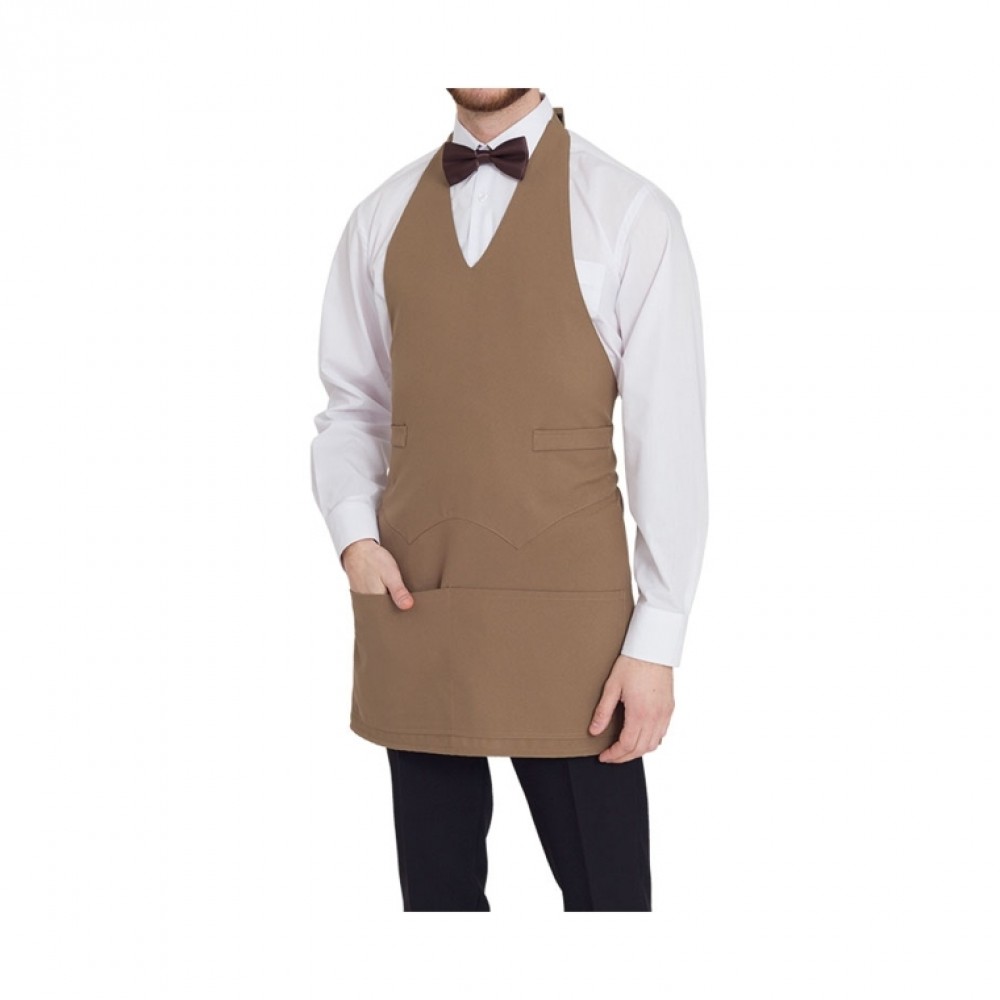 Grembiule unisex color tortora, 100% poliestere, 160 gr, tascone parte inferiore, allacciatura al collo con velcro.