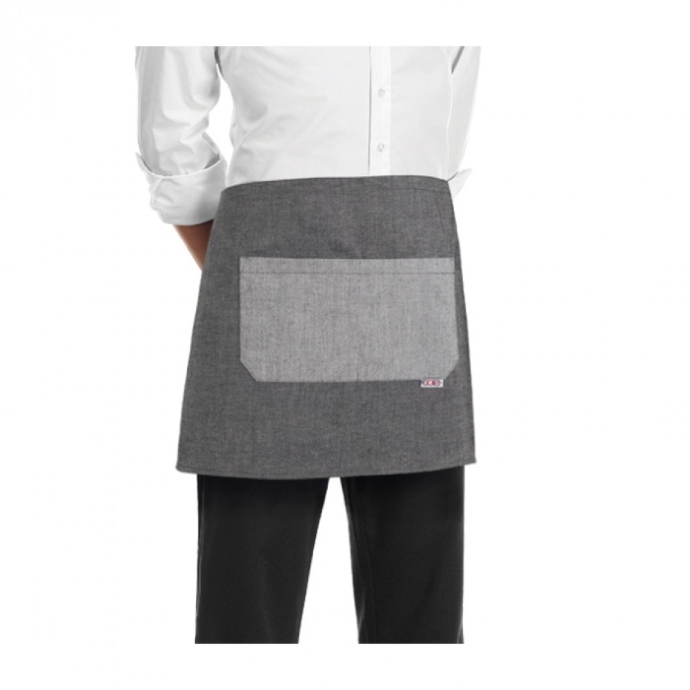 Grembiule vita con lacci, colore grigio bicolor, 65% poliestere 35% cotone, misure 40 x 70 cm, tascone con cucitura centrale, lavabile a 60°.