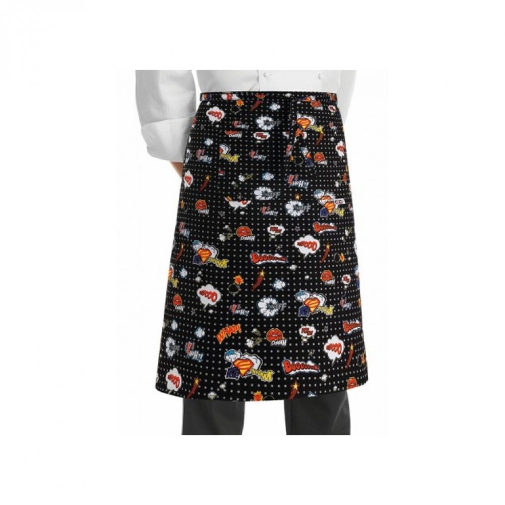 Grembiule unisex 100% cotone, misure 70 x 70 cm, sfondo nero stampato, tascone centrale, lavabile a 60°.