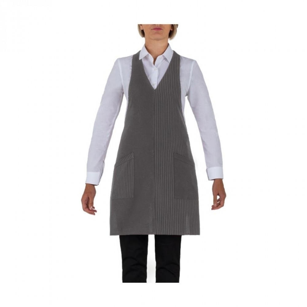 Grembiule con pettorina gessato grigio, 99% poliestere 1% viscosa, 170 gr, 2 tasche, allacciatura al collo regolabile dai bottoni, lavabile a 60°, asciugatura rapida.