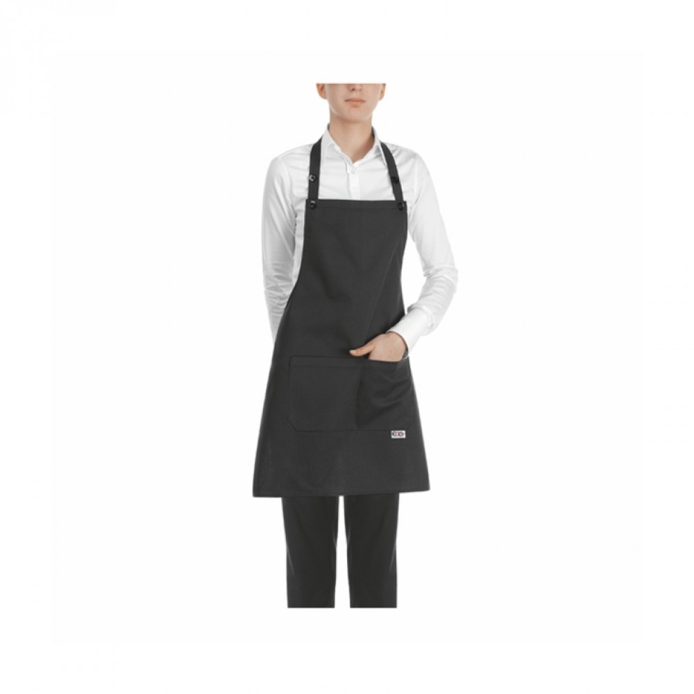 Grembiule con pettorina nero, 65% poliestere 35% cotone, tascone centrale, laccetto al collo regolabile dai bottoni, misure 70 x 70 cm, lavabile a 60°.
