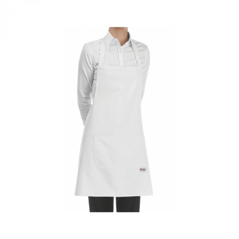 Grembiule con pettorina bianco, 100% cotone, tascone centrale, laccetto al collo regolabile dai bottoni, misure 70 X 70, lavabile a 60°.