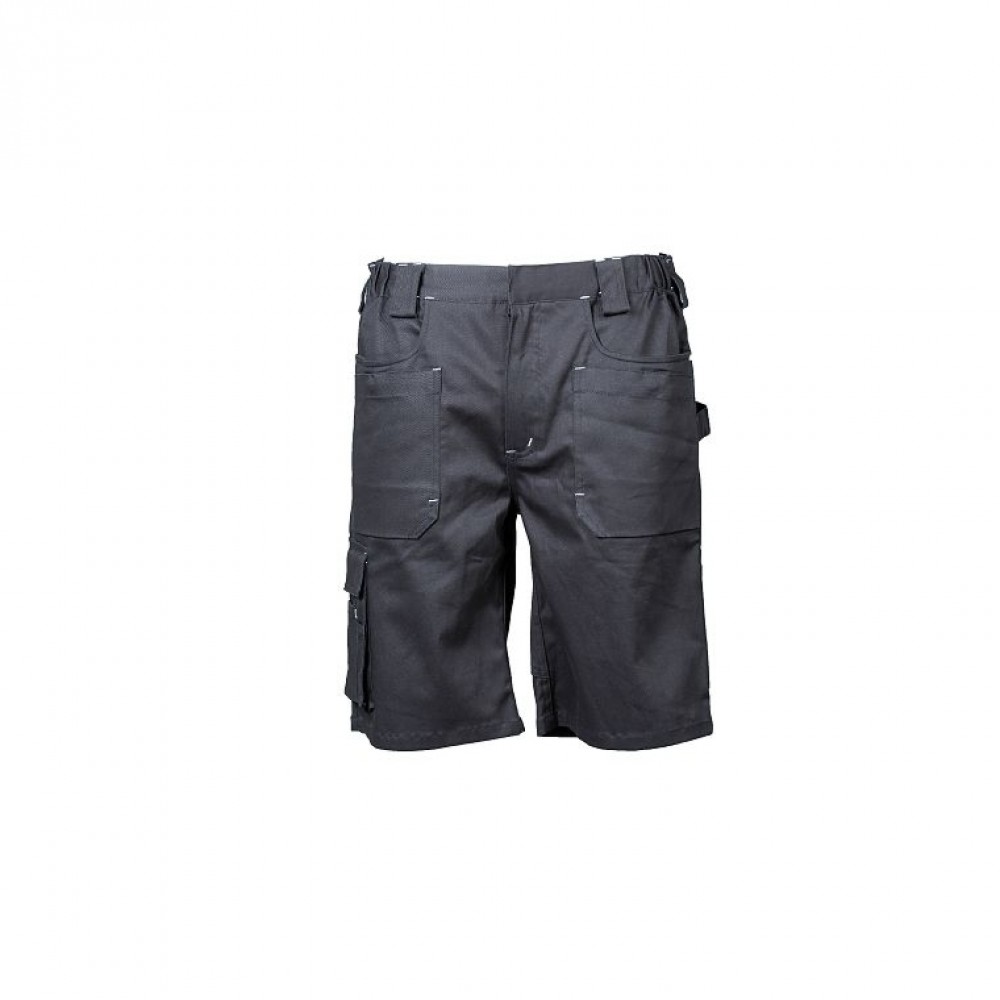 Pantaloncino da lavoro multitasche elasticizzato, 98% cotone 2% elastan, 250 gr, dettagli e cuciture in contrasto, gancio portamartello, tasca portametro, rinforzo posteriore antistrappo.
