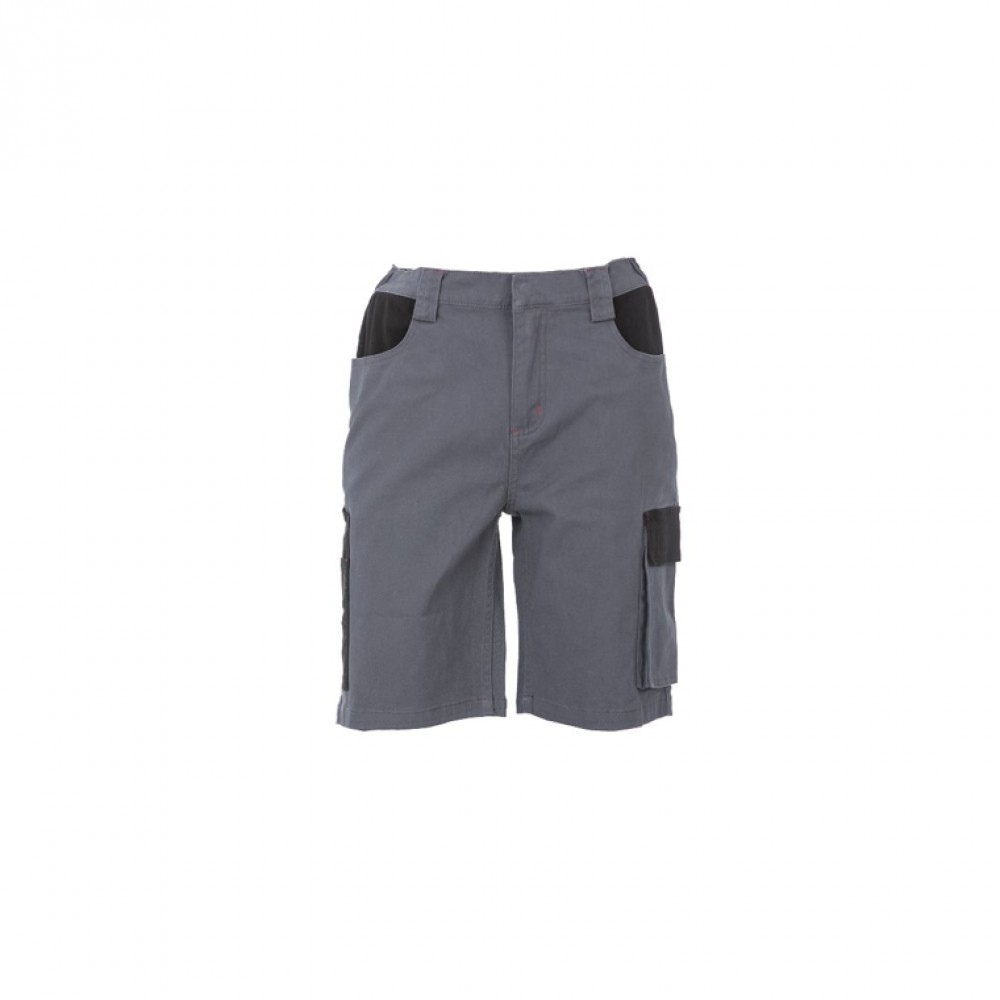 Pantaloncino grigio multitasche elasticizzato, 98% cotone 2% elastan, 250 gr, dettagli e cuciture in contrasto, tessuto prelavato.