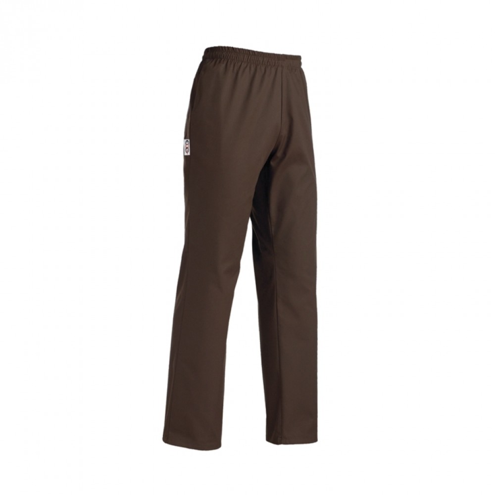 Pantalone da cucina marrone, 65% poliestere 35% cotone, 200 gr, regolabile in vita con coulisse, tasche anteriori, taschino posteriore, lavabile a 60°.