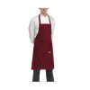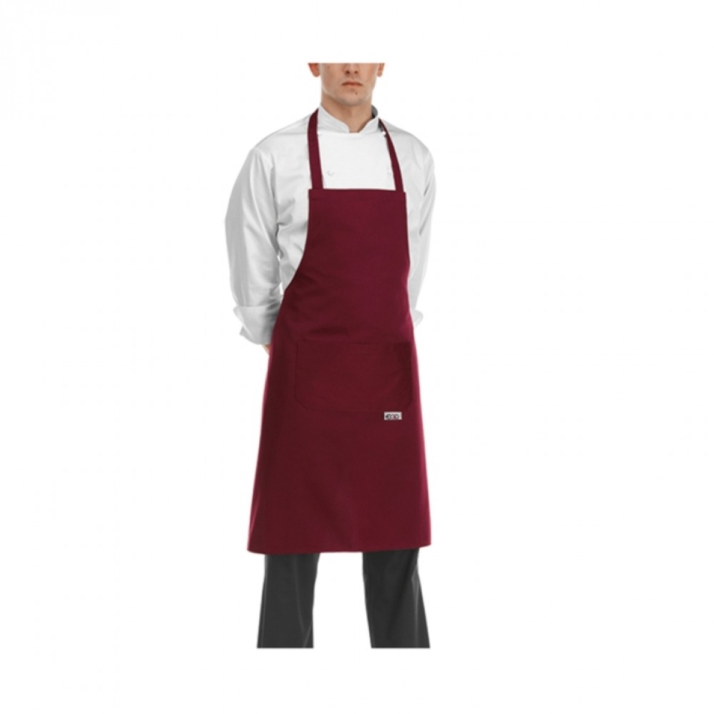Grembiule con pettorina, colore bordeaux, 65% poliestere 35% cotone, tascone centrale, misure 90 x 70 cm, lavabile a 60°.