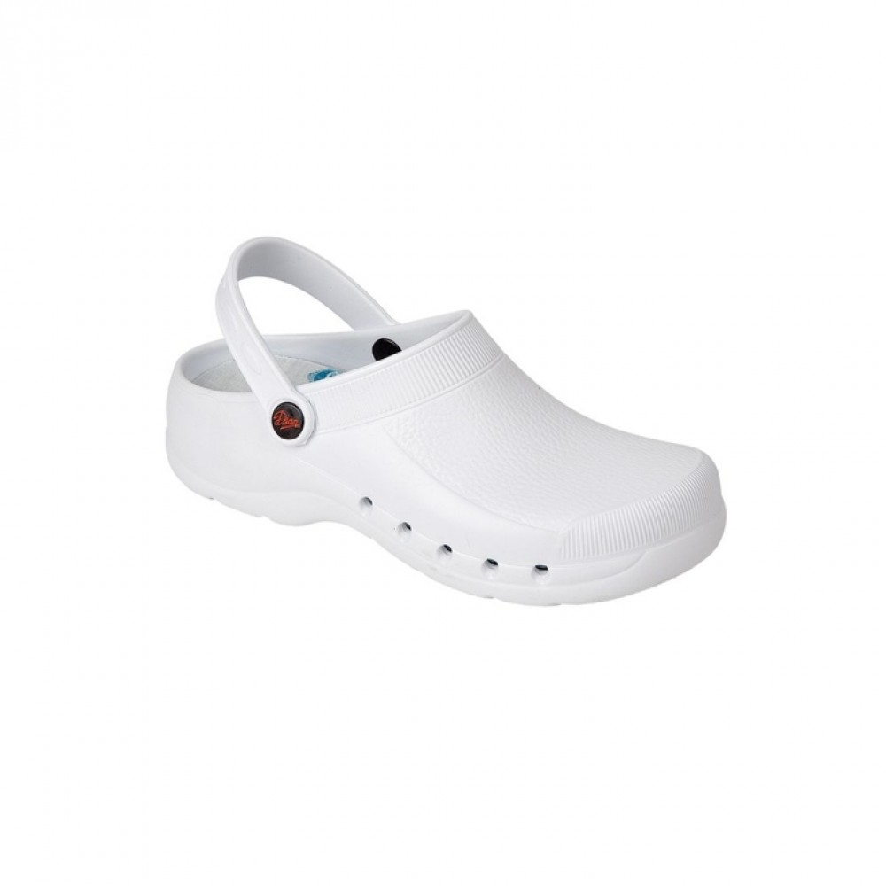 Zoccolo SRA bianco in EVA, ultraleggero, anatomico e antiscivolo, lavabile a 40°, cinturino posteriore ripiegabile, fori traspiranti sui lati, soletta interna in tessuto. Omologazione EN 20347. Disponibile dal n 35 al 46.
